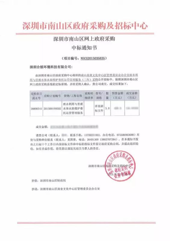 2015年10月20日,深圳合续环境科技有限公司收到了深圳市南山区政府发出的“中标通知书”,通知中标南山商业文化中心区管理委员会办公室“雨水利用与景观水体水质维护委托运营管理服务”(三年)。收到中标通知书后,我司即刻与管委会联系洽谈具体工作,并与原维护方进入交接程序。